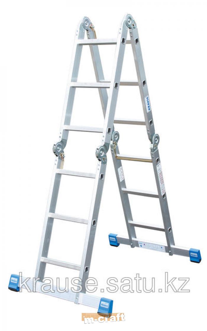 Алюминиевая лестница для профессионального применения. Шарнирная универсальная лестница. Четырехсекционная универсальная алюминиевая шарнирная лестница: применяется как двусторонняя стремянка, как приставная лестница и как рабочая платформа. Легко и быстро складывается, умещается в багажнике автомобиля. Запатентованная система шарниров-фиксаторов KRAUSE с дужкой для одновременного привода в действие обеих шарниров одной рукой. Две широкие поперечные траверсы с двухкомпонентными заглушками увеличивают опорную площадь. |