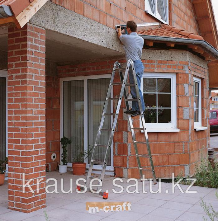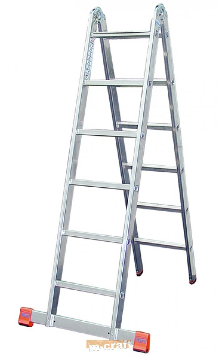 Alumīnija kāpnes mājsaimniecības un pusprofesionālai lietošanai. Divu sekciju šarnīrveida kāpnes. Alumīnija divsekciju šarnīrveida kāpnes izmantošanai kā divpusējas kāpnes un pagarināmās kāpnes. Patentēta KRAUSE eņģu bloķēšanas sistēma ar šarnīru, kas nodrošina abu eņģu vienlaicīgu darbību ar vienu roku. No visām pusēm profilētas pakāpieni drošai uzkāpšanai un nokāpšanai. Plaša šķērssija ar divkomponentu aizbāžņiem palielina atbalsta laukumu.
