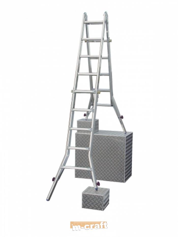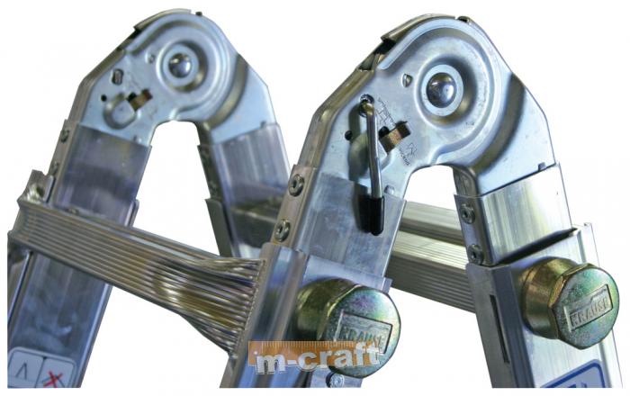 Alumīnija kāpnes profesionālai lietošanai. Universālas šarnīrveida kāpnes. Četru sekciju universālas alumīnija šarnīrveida kāpnes: var izmantot kā divpusējas kāpnes, kā pagarināmās kāpnes un kā darba platformu. Ātri un viegli salokāmas un ietilpst automašīnas bagāžniekā. Patentēta KRAUSE eņģu bloķēšanas sistēma ar šarnīru, kas nodrošina abu eņģu vienlaicīgu iedarbināšanu ar vienu roku. Divas platas šķērssijas ar divkomponentu aizbāžņiem palielina atbalsta laukumu. |